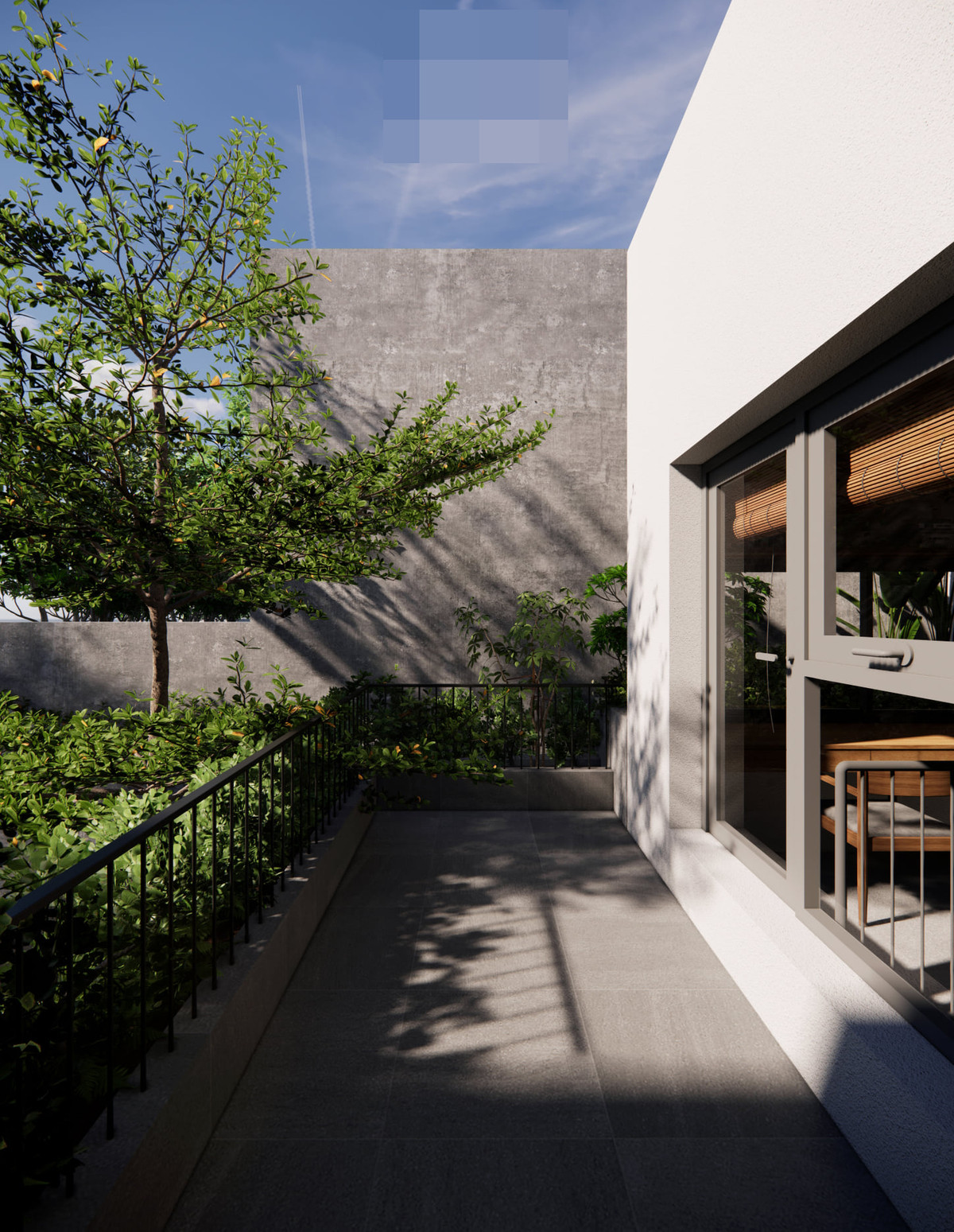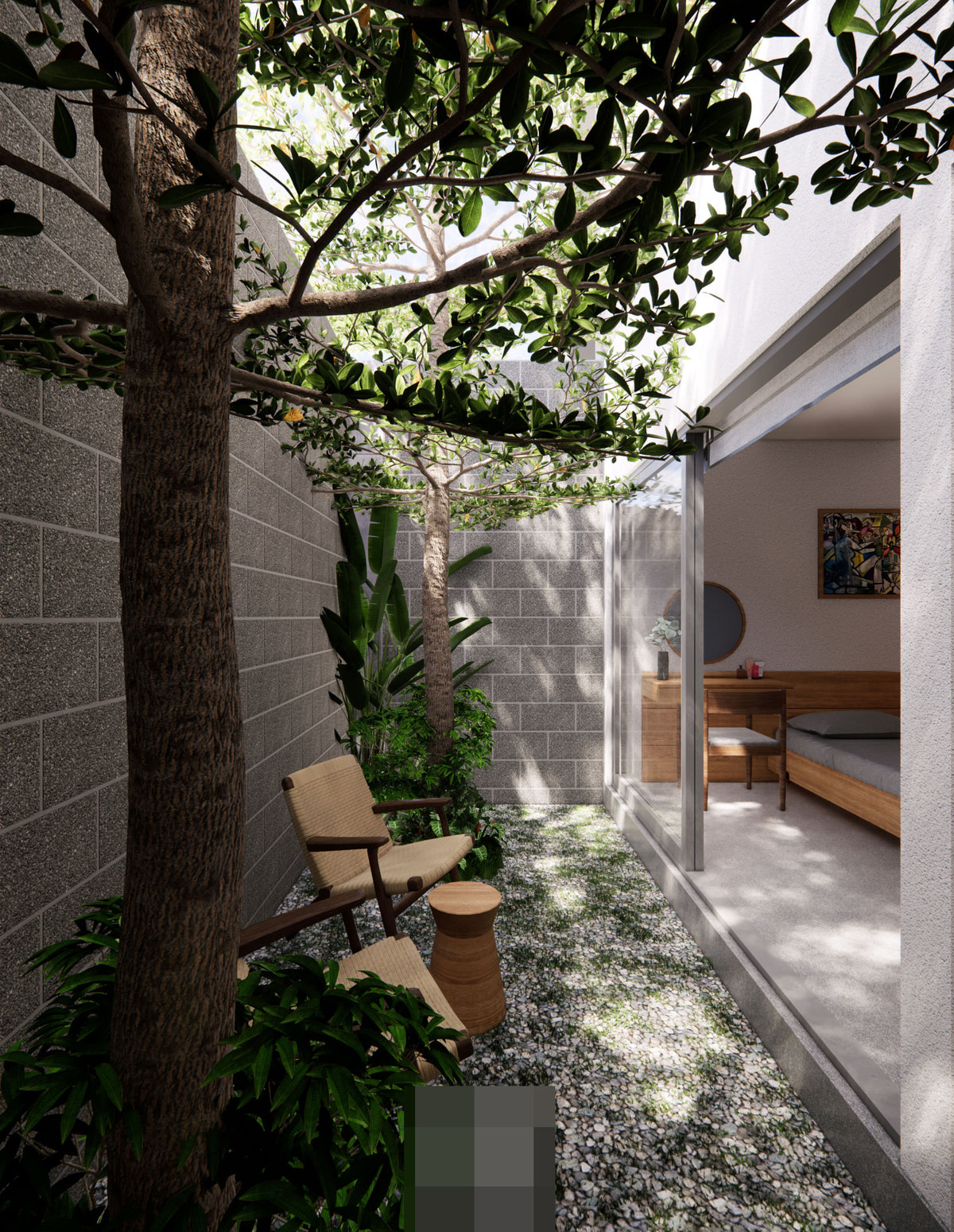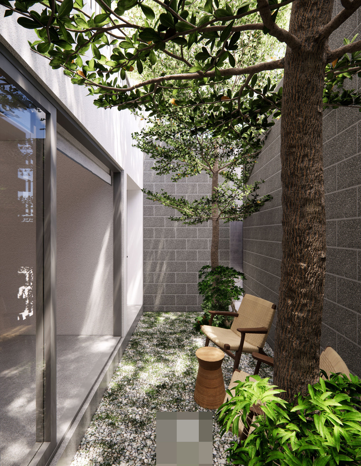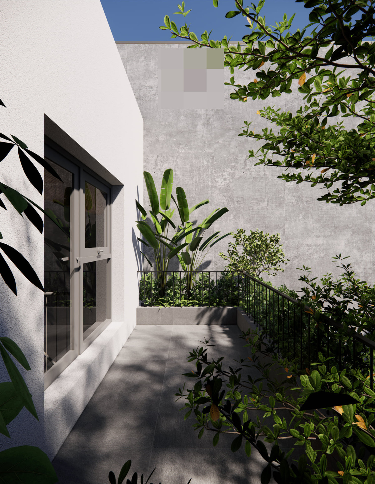 Góc vườn cạnh phòng ngủ chính, ngăn cách với thế giới bên ngoài bằng bức tường cao, đảm bảo sự kín đáo.