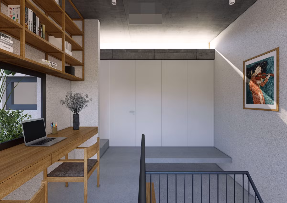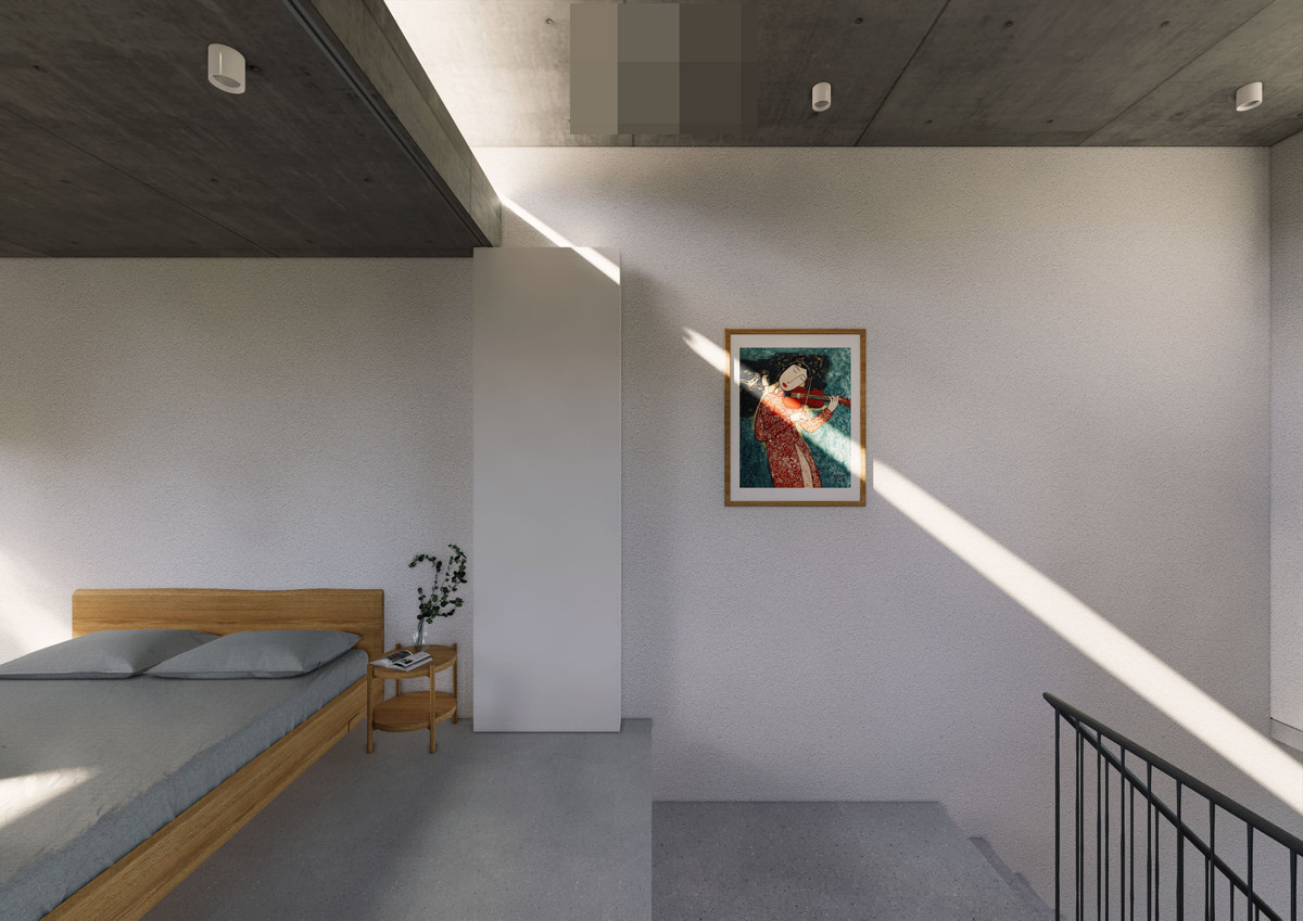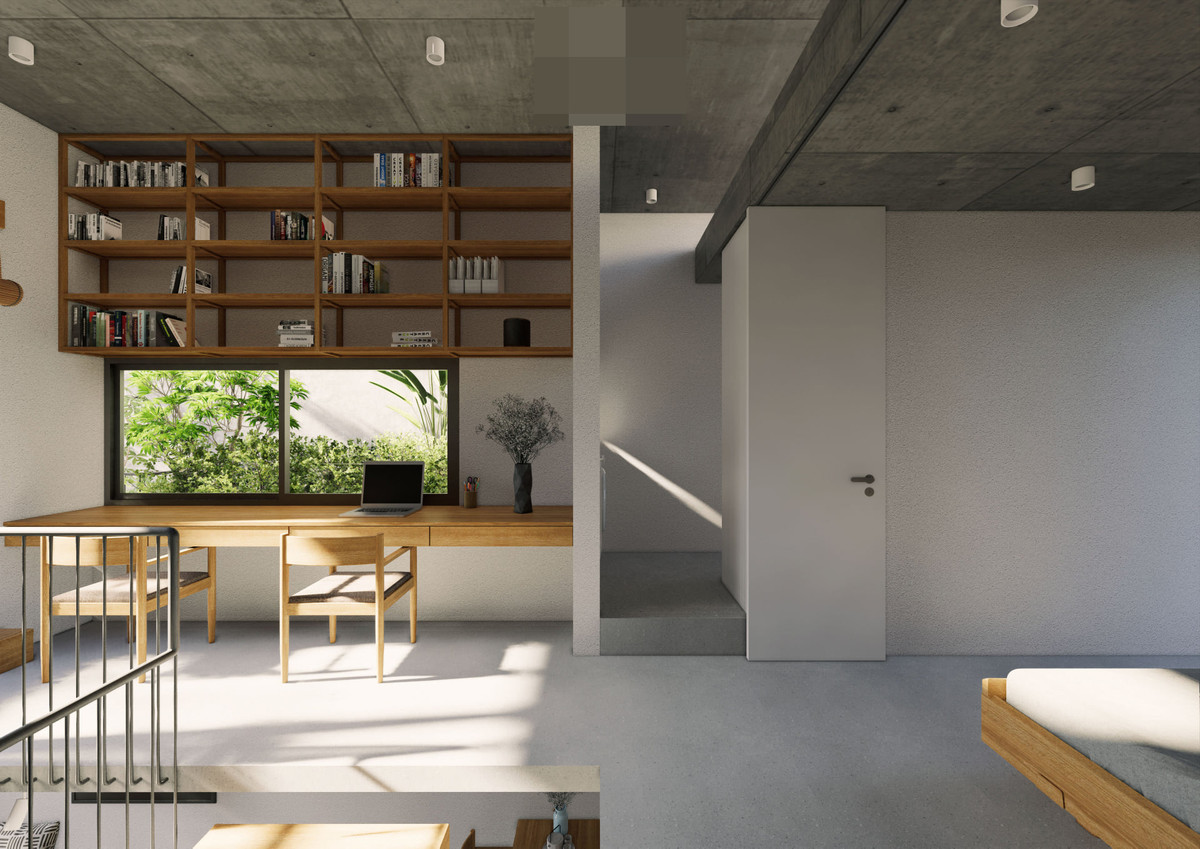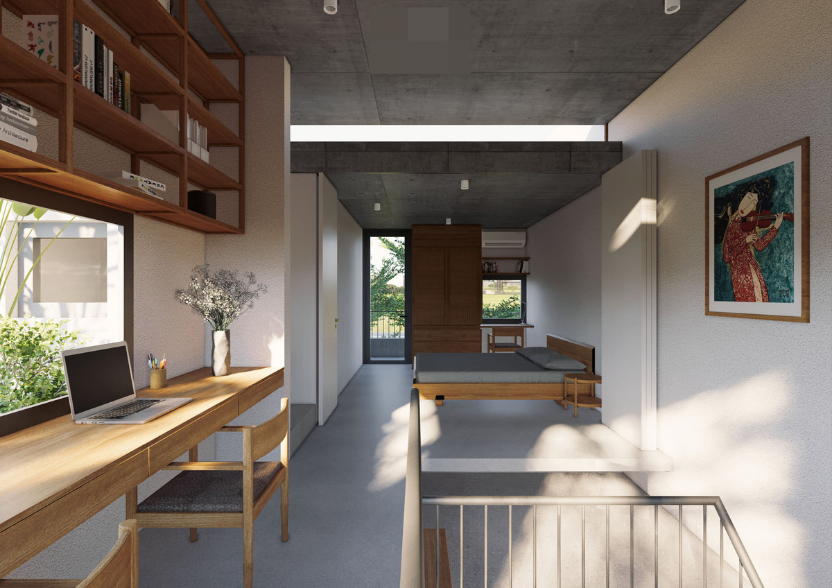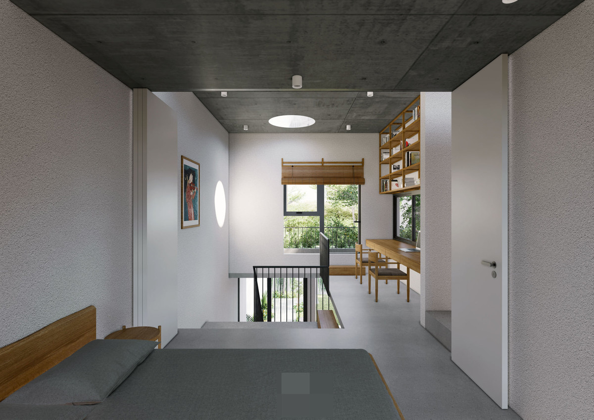 Gần bàn làm việc là phòng ngủ nhỏ. Ở các không gian này đều có cửa sổ lớn, thu tối đa ánh sáng vào nhà.