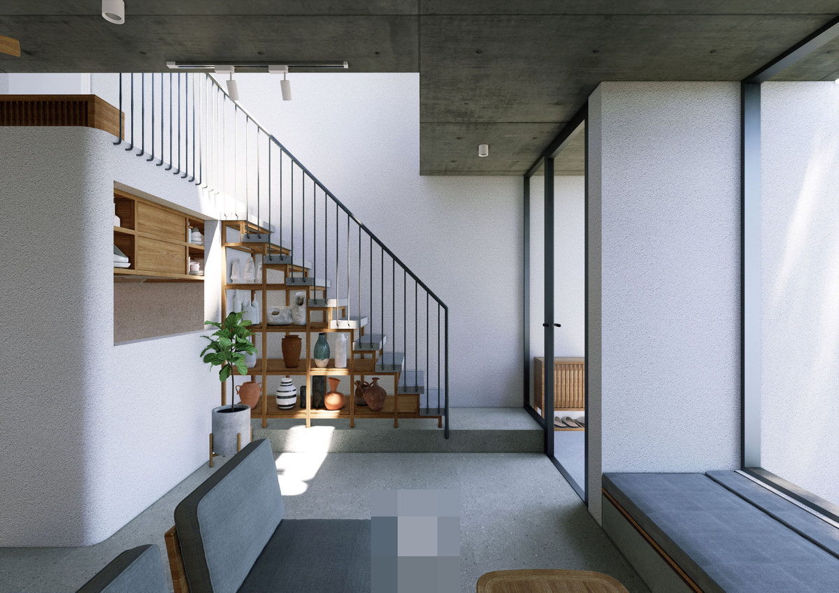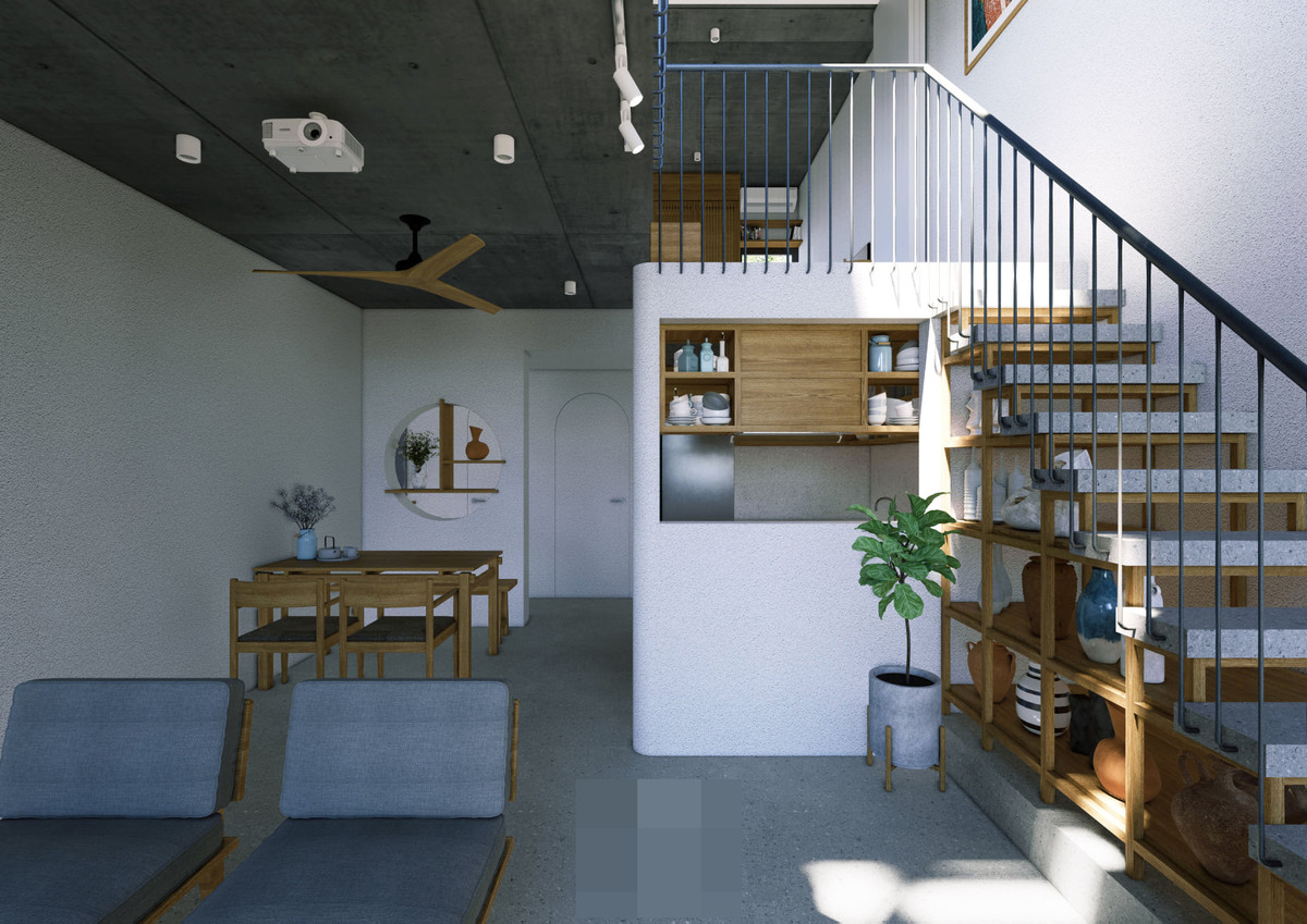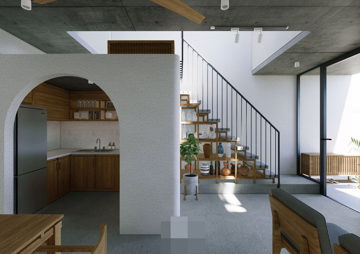 Bếp nằm ở khu vực cầu thang, có yếu tố riêng tư nhưng không hề tách biệt với phòng khách.