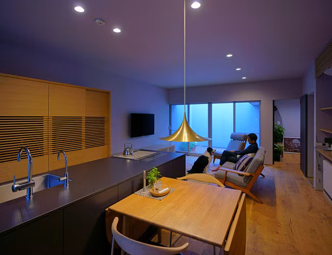 Căn nhà hai tầng rộng 92.75 m2 tại Nhật Bản có mặt tiền bên ngoài tối giản. Sự đơn giản trong thiết kế dường như là một điều hấp dẫn trong văn hóa đất nước mặt trời mọc. Là một người đam mê xe hơi và xe đạp, chủ nhà hy vọng thiết kế của căn nhà có thể giúp anh nhìn thấy chiếc xe yêu thích từ không gian phòng ngủ thoải mái của mình. Trong khi đó, vợ anh mong muốn một không gian mà cô có thể dành thời gian yên tĩnh với chú chó của mình. Ngôi nhà hai tầng này hoàn toàn thỏa mãn cả hai yêu cầu trên
