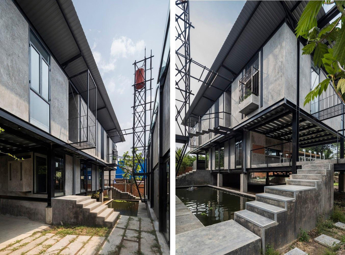Kiến trúc sư Truong An Architecture thiết kế ngôi nhà sàn 300 m² hiện đại, bao gồm hai khối nhà hình chữ nhật với hai ao tự nhiên nối trực tiếp với kênh.