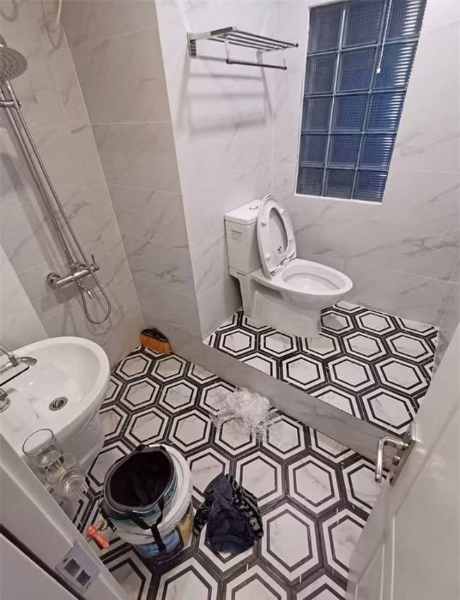 Phòng tắm nhỏ đẹp này rất phù hợp với diện tích căn tập thể mà vẫn đầy đủ tiện ích cho nhu cầu sinh hoạt của cả gia đình. Có khu vực tắm riêng, có bồn cầu và bồn rửa mặt riêng, tạo nên sự thuận tiện trong việc sử dụng.