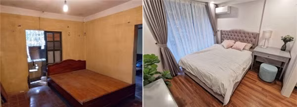 Phòng khách trước và sau khi cải tạo. Nội thất có thiết kế đơn giản, màu sắc trang nhã được kết hợp khéo léo, hài hòa tạo cảm giác thoáng mát, rộng rãi cho ngôi nhà.