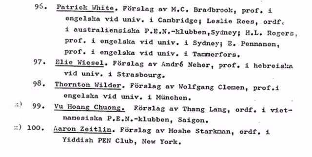 Tháng 2/2023, Ủy ban Nobel công bố danh sách 100 cái tên được đề cử trao giải Nobel Văn học vào năm 1972. Điều này là phù hợp với quy định của tổ chức này (giữ kín thông tin đề cử trong 50 năm). Điều gây bất ngờ là ở Việt Nam có một người xuất hiện trong danh sách 100 cái tên đó. Viện Hàn lâm Thụy Điển chú thích ông là nhà thơ, Chủ tịch Hội Văn bút Việt Nam, lần đầu được đề cử và người giới thiệu là Thang Lang. Nhà thơ đó chính là Vũ Hoàng Chương.