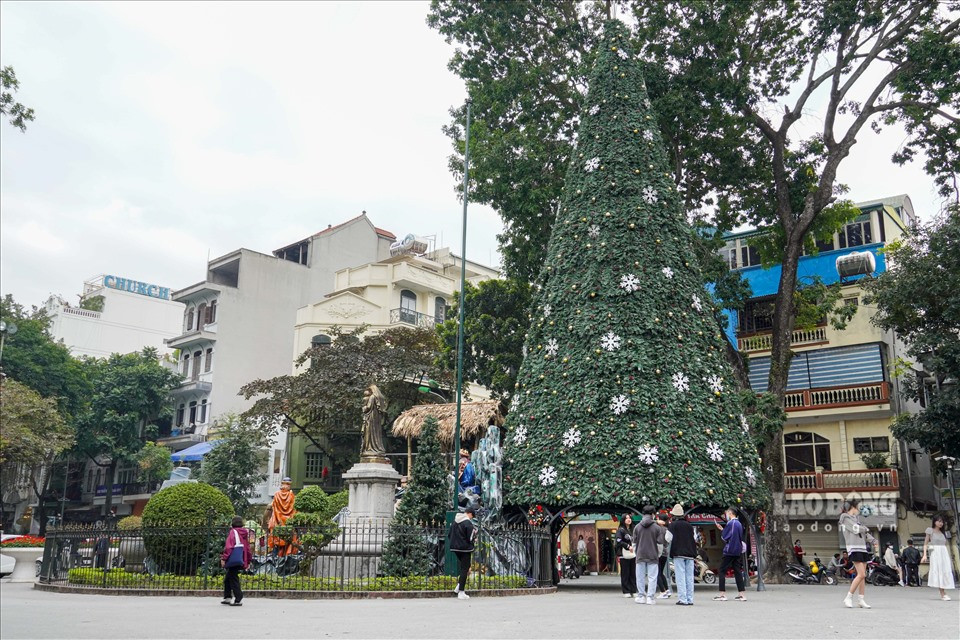 Dù nhà thờ đang được tu sửa, nhưng đây vẫn là địa điểm check-in quen thuộc của các bạn trẻ. Phía khoảng sân trước nhà thờ, cây thông noel vẫn được trang trí lộng lẫy.