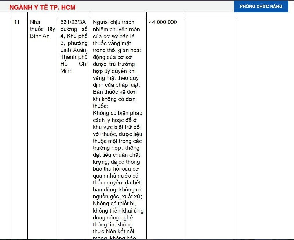 Cụ thể, xử phạt Nhà thuốc tây Bình An (561/22/3A đường số 4, Khu phố 3, phường Linh Xuân, Thành phố Hồ Chí Minh) 44 triệu đồng.