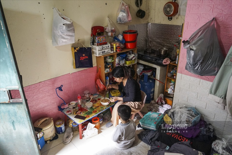 Thời điểm này cũng là lúc chị Lan đang nấu bữa trưa cho hai mẹ con để chuẩn bị cho ca làm việc kéo dài 11 tiếng đồng hồ.