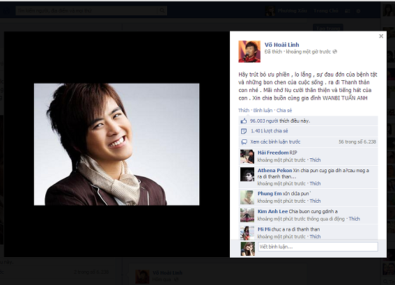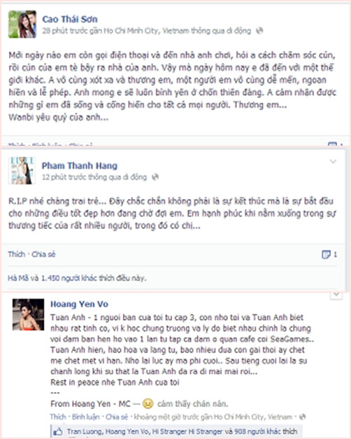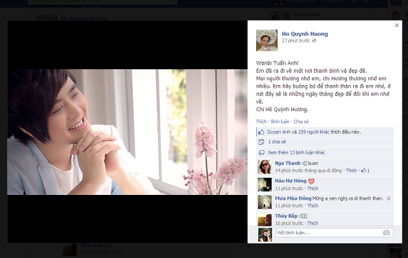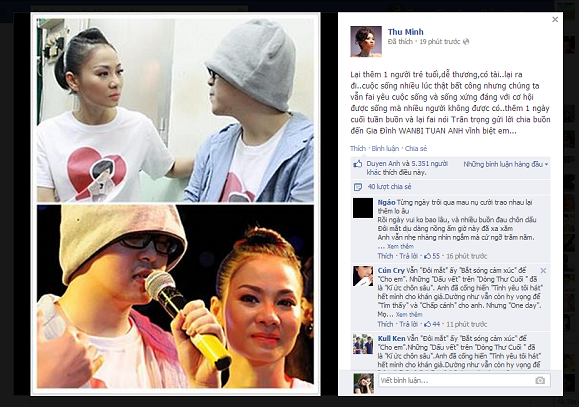 "Lại thêm 1 người trẻ tuổi, dễ thương, có tài ra đi. Cuộc sống nhiều lúc thật bất công nhưng chúng ta vẫn phải yêu cuộc sống và sống xứng đáng với cơ hội được sống mà nhiều người không được có. Thêm 1 ngày cuối tuần buồn và lại phải nói: Trân trọng gửi lời chia buồn đến Gia Đình WANBI TUAN ANH vĩnh biệt em...", Thu Mình chia sẻ.