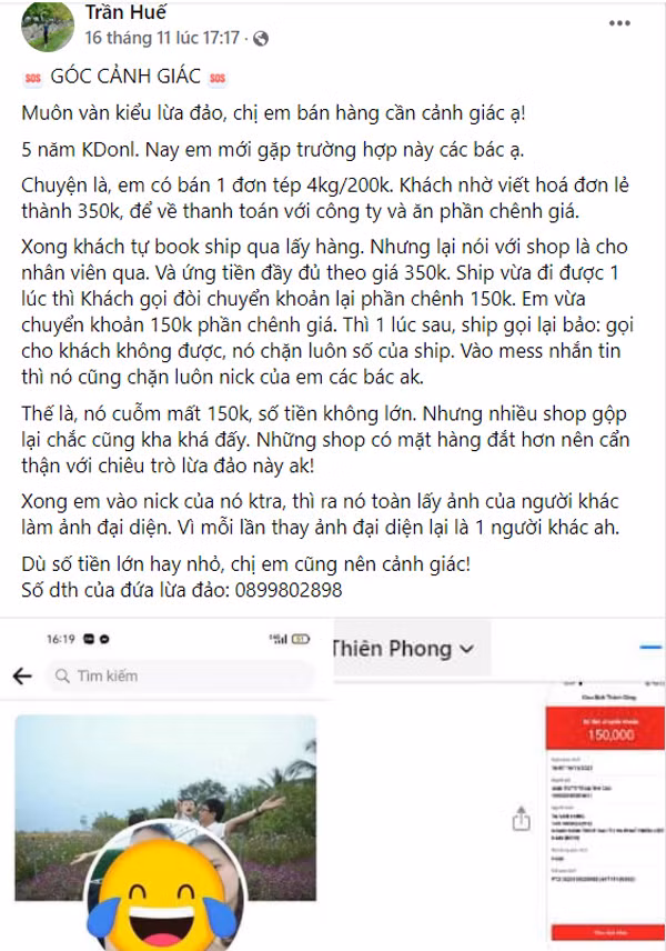Khi shipper đã đi, chị nhận được cuộc gọi của người khách đó. Họ muốn chị chuyển khoản cho họ số tiền chênh lệch là 150.000 đồng. Chị đã nhận tiền của shipper nên cứ thế chuyển tiền mà không nghĩ ngợi gì.