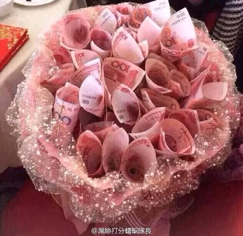 Bó hoa giấy gấp từ 99 tờ mệnh giá 100 nhân dân tệ.