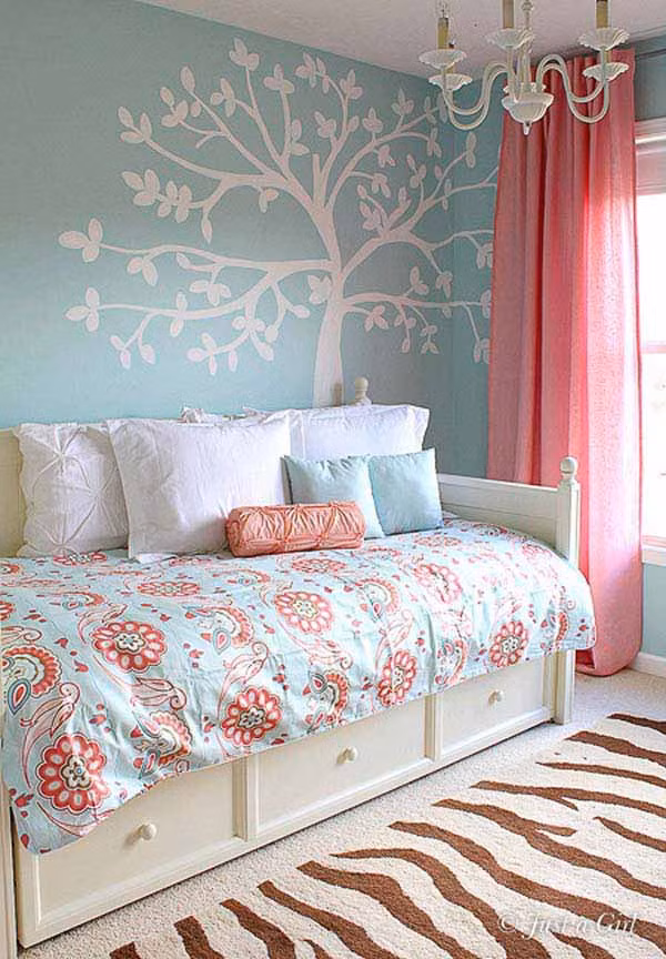 Trang trí phòng ngủ với bức tường hình rừng cây ấn tượng.