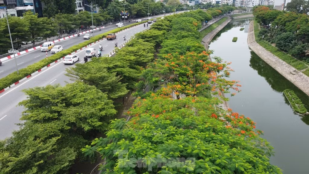 Cây xanh phủ kín trên tuyến phố dọc hai bên dòng sông Tô Lịch trên địa bàn quận Cầu Giấy.