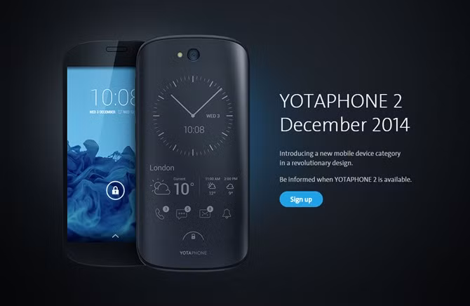 Vào năm 2013, nhà sản xuất Yota của Nga đã tự hào giới thiệu chiếc điện thoại đầu tiên sử dụng màn hình e-ink tiết kiệm năng lượng ở mặt sau và mặt trước là một màn hình LCD thông thường. YotaPhone chạy hệ điều hành Android của Google.