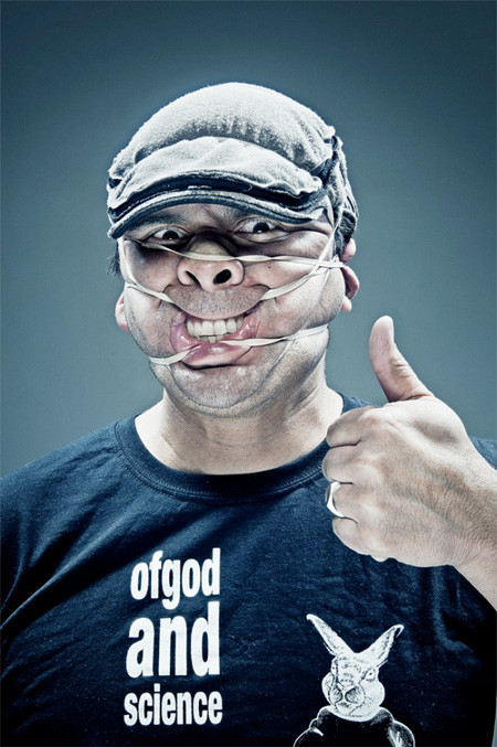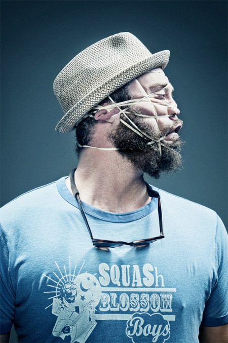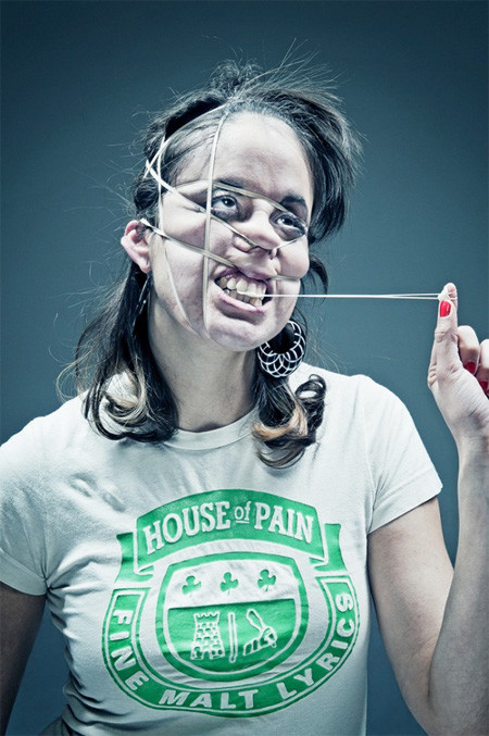 Dựa trên tạo hình những nhân vật hoạt hình yêu thích, Shay dùng dây cao su quấn quanh mặt để tạo ra các bộ mặt xấu xí nhưng lại vô cùng thú vị.