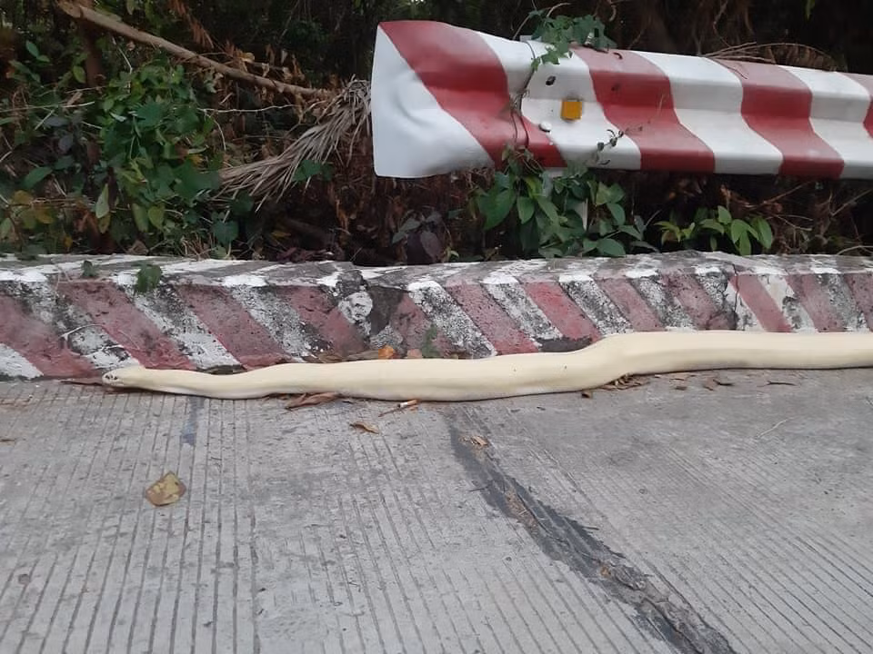 Con trăn này dài khoảng 3m, nặng trên chục ký và là loại trăn bạch tạng hiếm thấy trong tự nhiên. Dù rất nhiều người tò mò kéo đến quan sát nhưng con trăn này vẫn nằm im, không có dấu hiệu tấn công một ai.