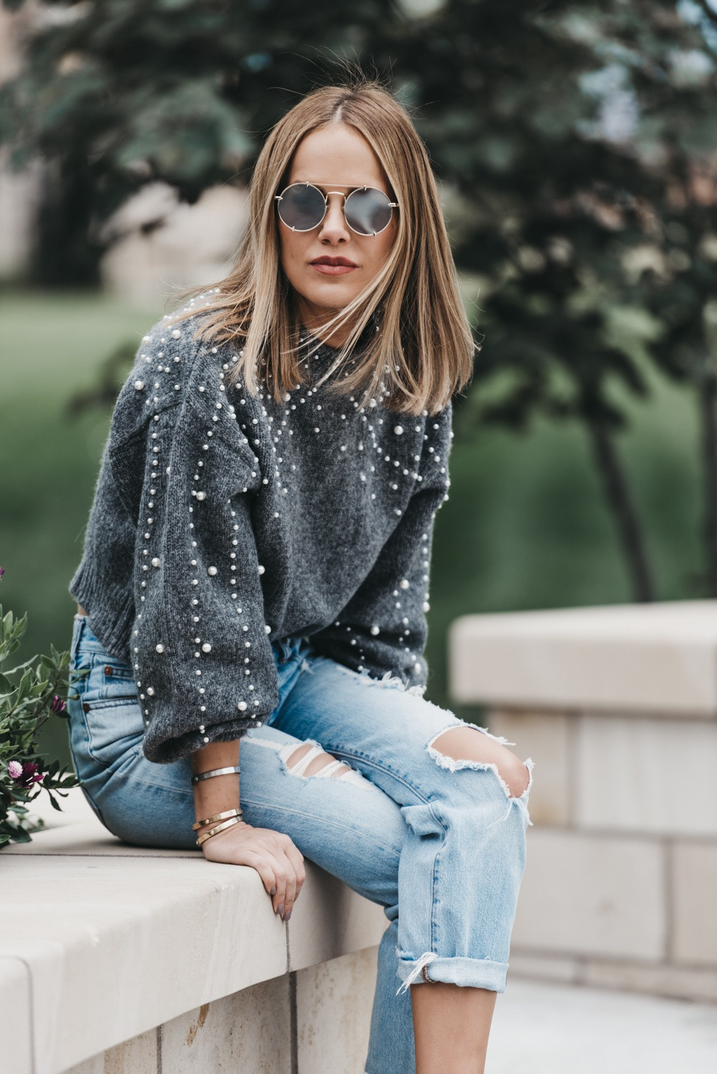 2. Áo len đính cườm: Trang Sohu cho rằng xu hướng thời trang của thập niên 90 đang quay trở lại và thịnh hành dịp gần đây. Những hạt ngọc trai được nhà thiết kế khéo léo thêu dệt vào phần cổ áo hay cánh tay tạo nên sự sang trọng, thời thượng. Nếu yêu thích vẻ ngoài điệu đà, phái nữ có thể lựa chọn dáng áo tay loe. Bên cạnh đó, màu sắc tối giản kết hợp với quần jeans rách đem lại diện mạo cá tính cho hội chị em. Ảnh: The fashion fuse, Stylelimits.