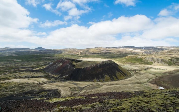 Grabrokarfell tại Iceland mang đến một khoảnh khắc tuyệt đẹp khi nhìn từ trên cao xuống. Cảnh quan xung quanh đẹp như một bức tranh hài hòa về màu sắc, miệng núi lửa phủ đầy cỏ kết hợp lớp đất đen sườn núi tạo nên vẻ đẹp hoang sơ, hùng vĩ.