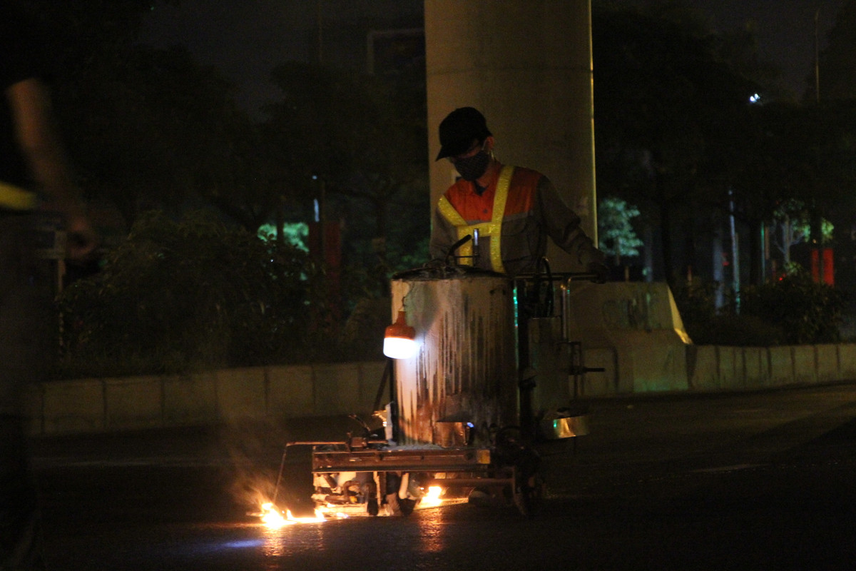 Theo lời nhóm công nhân, họ bắt đầu công việc từ 21h đến 3h sáng hôm sau. Theo các công nhân, tranh thủ đợt giãn cách, mỗi ngày họ thực hiện việc kẻ, sửa chữa một cung đường không cố định.