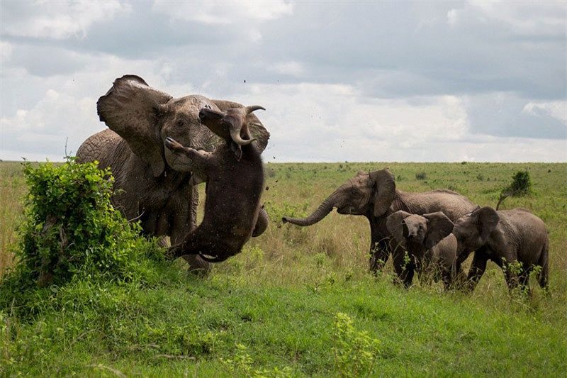 Với kích thước và sức khỏe vượt trội, cộng thêm việc sở hữu cặp ngà rắn chắc, sắc bén, con voi đã dễ dàng húc văng chú trâu lên trời.