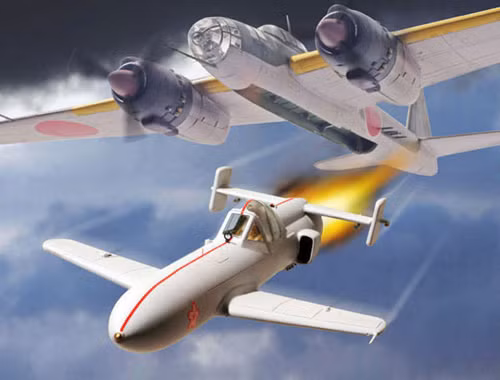 | Máy bay cảm tử Yokosuka MXY-7 Ohka của Nhật Bản là loại máy bay phản lực được thiết kế riêng cho các vụ tấn công cảm tử (Kamikaze) với một đầu đạn nặng hơn 1 tấn. Chúng được chở đến mục tiêu bằng cách gắn dưới bụng một chiếc máy bay Mitsubishi G4M. Sau khi được thả, phi công sẽ lái Ohka áp sát mục tiêu, khởi động động cơ phản lực và lao như một quả tên lửa xuống tàu địch. Được triển khai từ tháng 9/1944, loại vũ khí này đã đánh chìm được một tàu khu trục của Mỹ. |