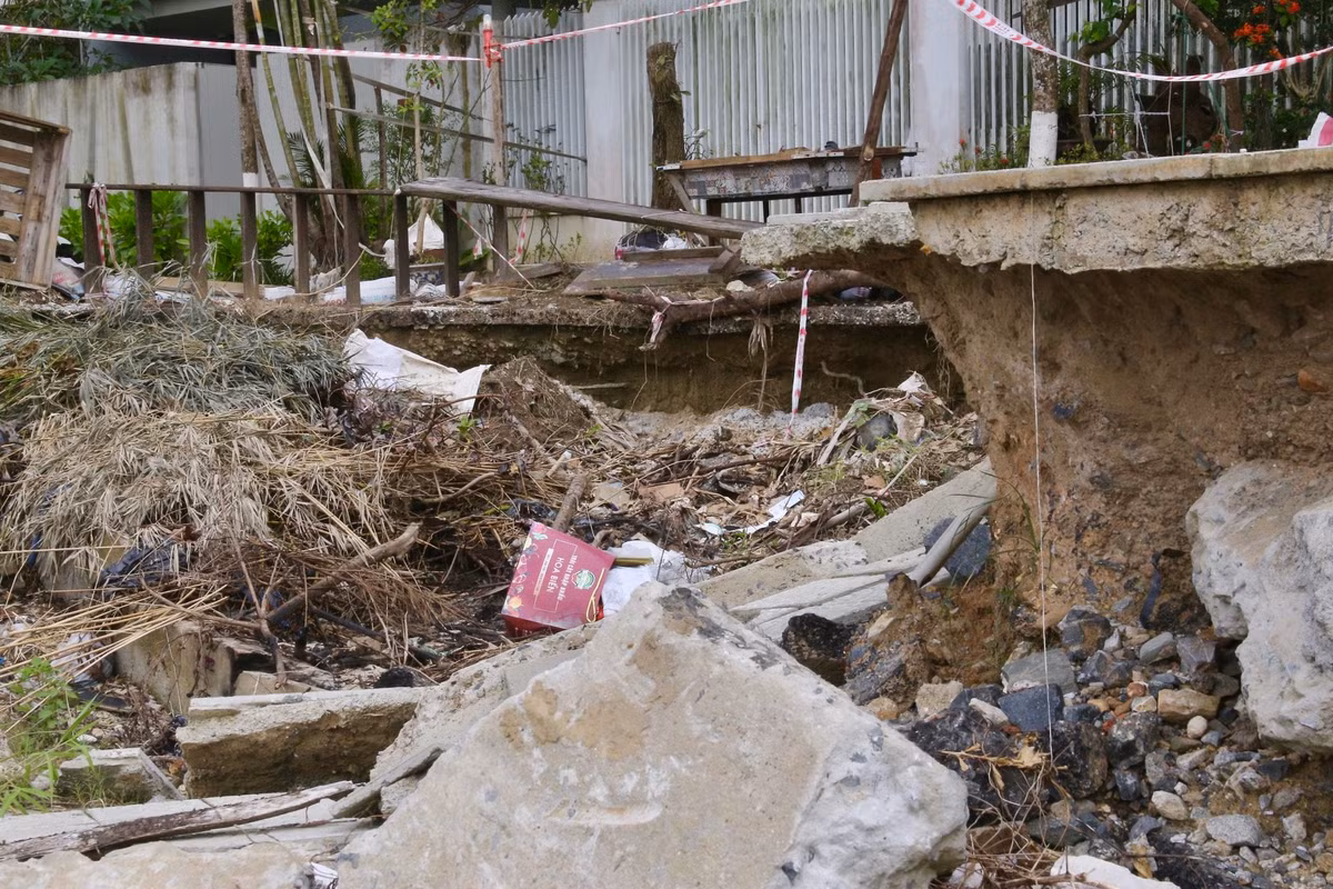 Ghi nhận của Tiền Phong, điểm sạt lở dài hàng chục mét, đất đá ngổn ngang. Vị trí sạt lở ngày càng ăn sâu vào tuyến đường, nhiều mảng bê tông nằm nham nhở.