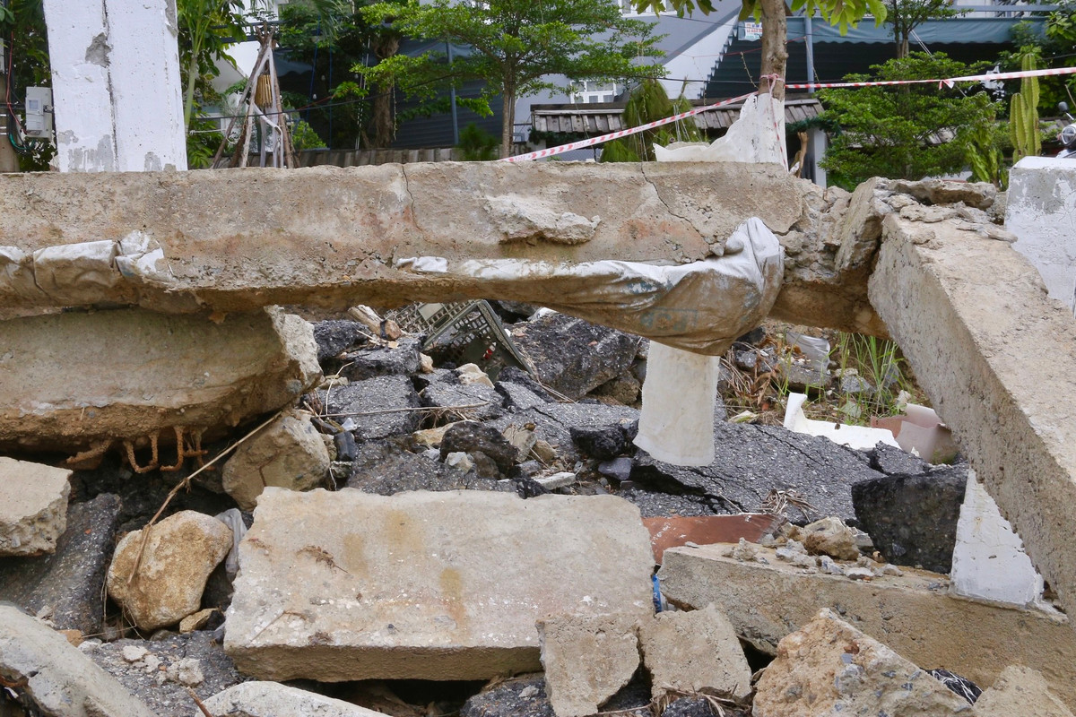 Nhiều mảng bê tông bong tróc, hư hỏng nặng nằm ngổn ngang.