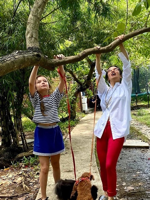 Cô cho con gái đi học kèn, sau đó về nhà, đi dạo quanh sân vườn cùng thú cưng.