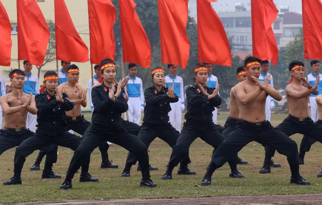 Ngự thiết công - bài tập này nam nữ chiến sỹ CSĐN dùng yết hầu đẩy cây thương sắc nhọn và chịu sức công phá. (Ảnh: Vũ Toàn)