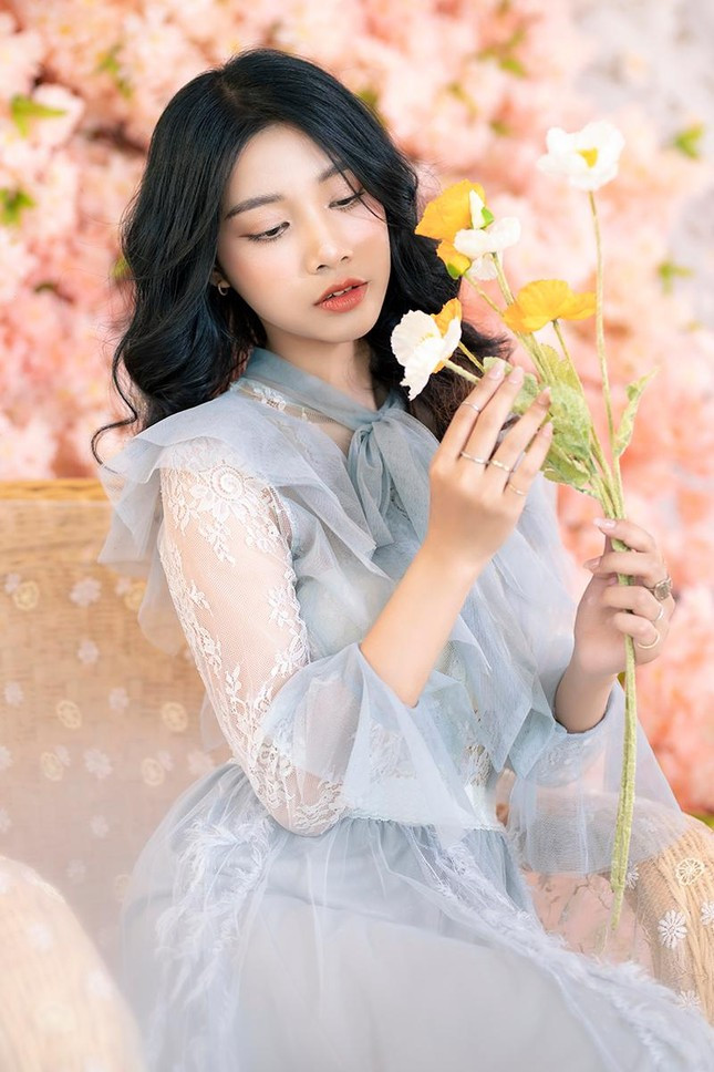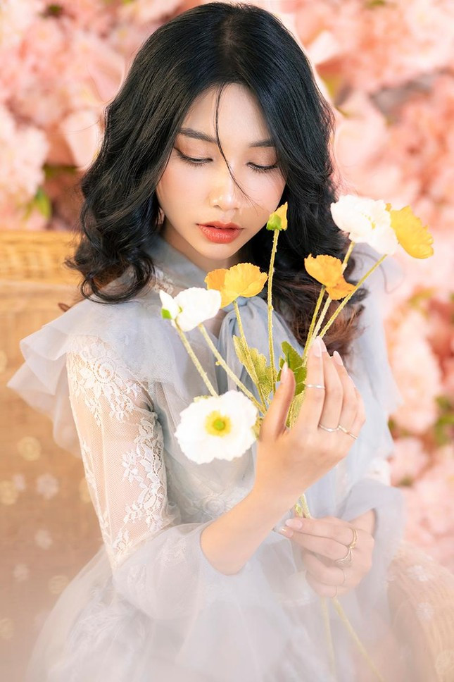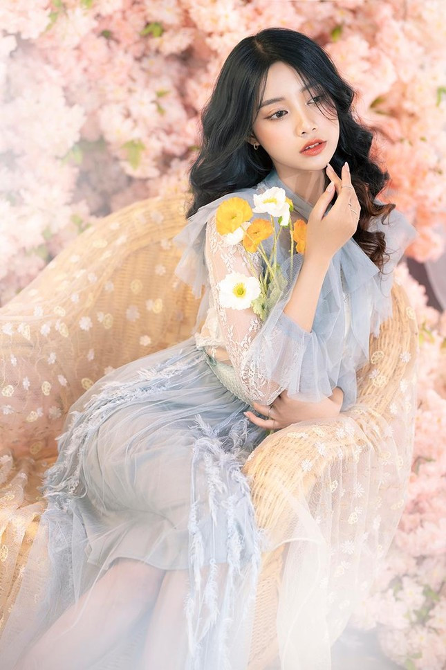 Thu Hường chia sẻ: “Đứng giữa vườn hoa này, mình đã nghĩ rằng, nếu có một dòng suối nhỏ chảy qua thì sẽ rất diễm lệ. Vậy nên, mình đã chọn một bộ váy màu xanh, để tạo cảm giác nhìn vào sẽ dễ chịu hơn trong thời tiết mùa hè này, cũng giống như tượng trưng cho con suối nhỏ, chảy qua”.