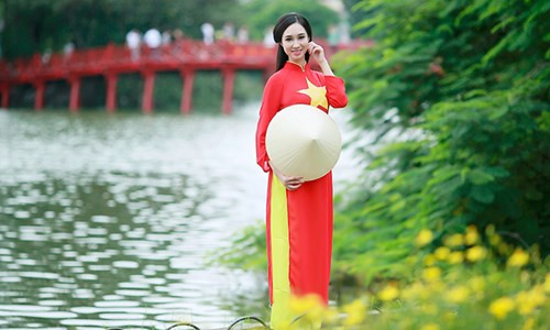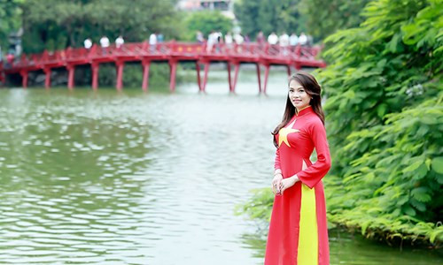 Các thí sinh mặc áo dài cờ đỏ sao vàng khoe nét duyên dáng gắn với hình ảnh quen thuộc của Thủ đô như cầu Thê Húc, Tháp Rùa, tượng đài Lý Thái Tổ.