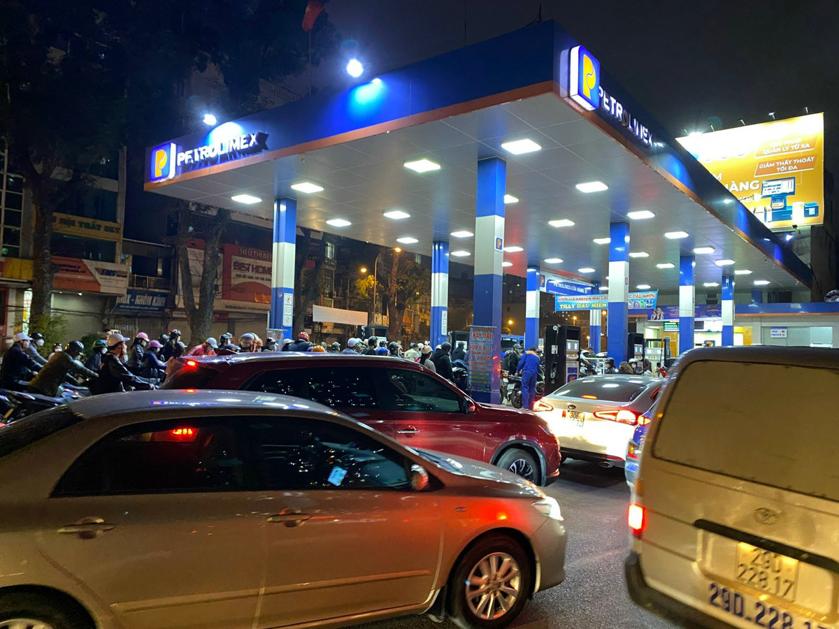 Cây xăng trên đường Láng đến 12h đêm qua vẫn rất đông người xếp hàng.
