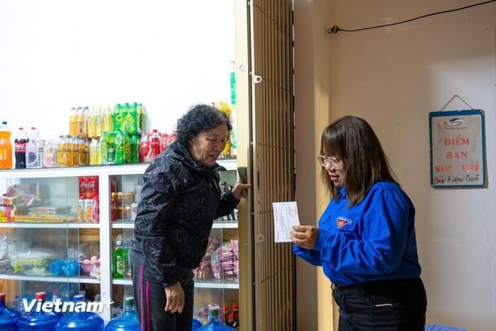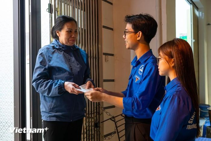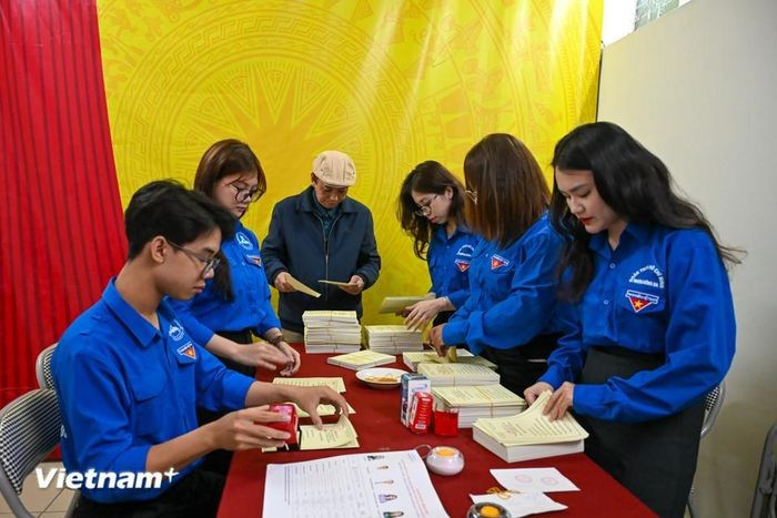 Lực lượng Đoàn viên thanh niên phường Đống Đa hỗ trợ các tổ bầu cử trong việc phát thẻ cử tri kịp thời đến người dân. (Ảnh: Minh Sơn/Vietnam+)