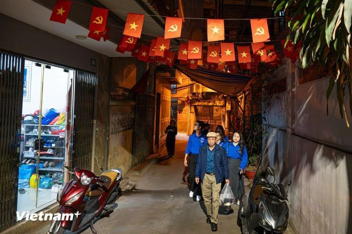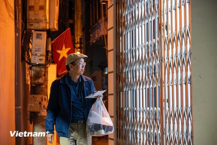 21 giờ tối, ông Việt với sự hỗ trợ của Đoàn Thanh niên phường Đống Đa và các tổ trưởng, tổ phó trên địa bàn đã đi trao những tấm thẻ cử tri cuối cùng cho người dân. (Ảnh: Minh Sơn/Vietnam+)