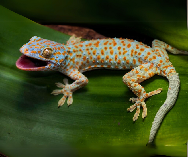 Tắc kè hoa có màu sắc đặc trưng, sở hữu bộ da sần màu xám xanh, lốm đốm các chấm đỏ cam.
