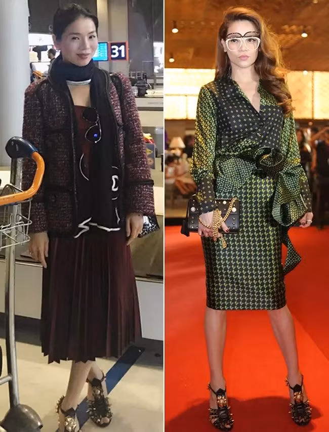 Một lần khác, Lệ Quyên và Hà Hồ cùng mê mệt đôi dép cao gót đinh cá tính của Gucci. Nhưng lần này, Hà Hồ ghi điểm hơn hẳn nhờ vẻ ngoài sành điệu còn trông Lệ Quyên lại già dặn. Đôi sandal này cũng có giá không hề rẻ khoảng 42 triệu đồng.