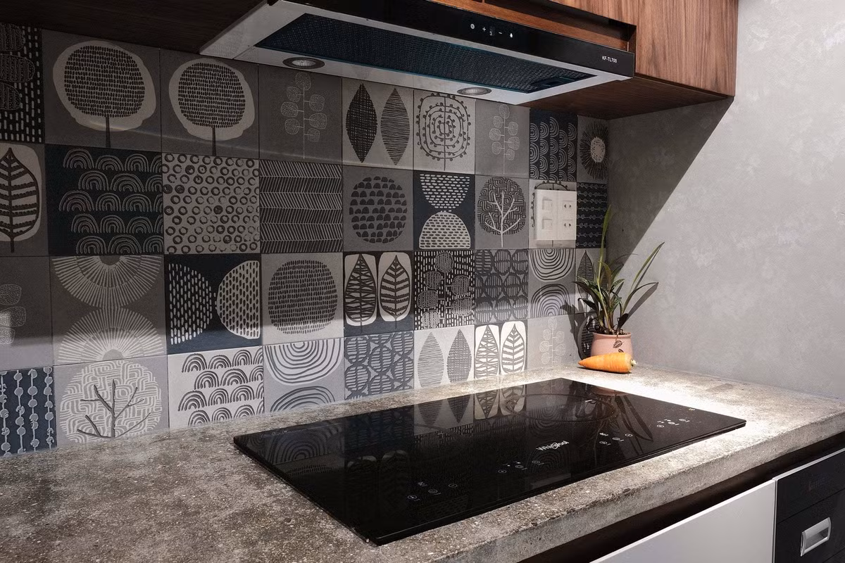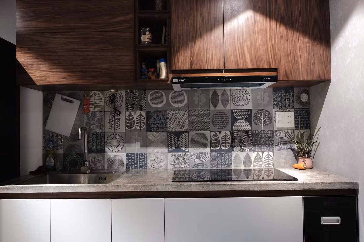 Tường bếp dùng loại gạch nhập từ Tây Ban Nha có giá 1,1 triệu/m2 và mặt bếp bằng đá mài.