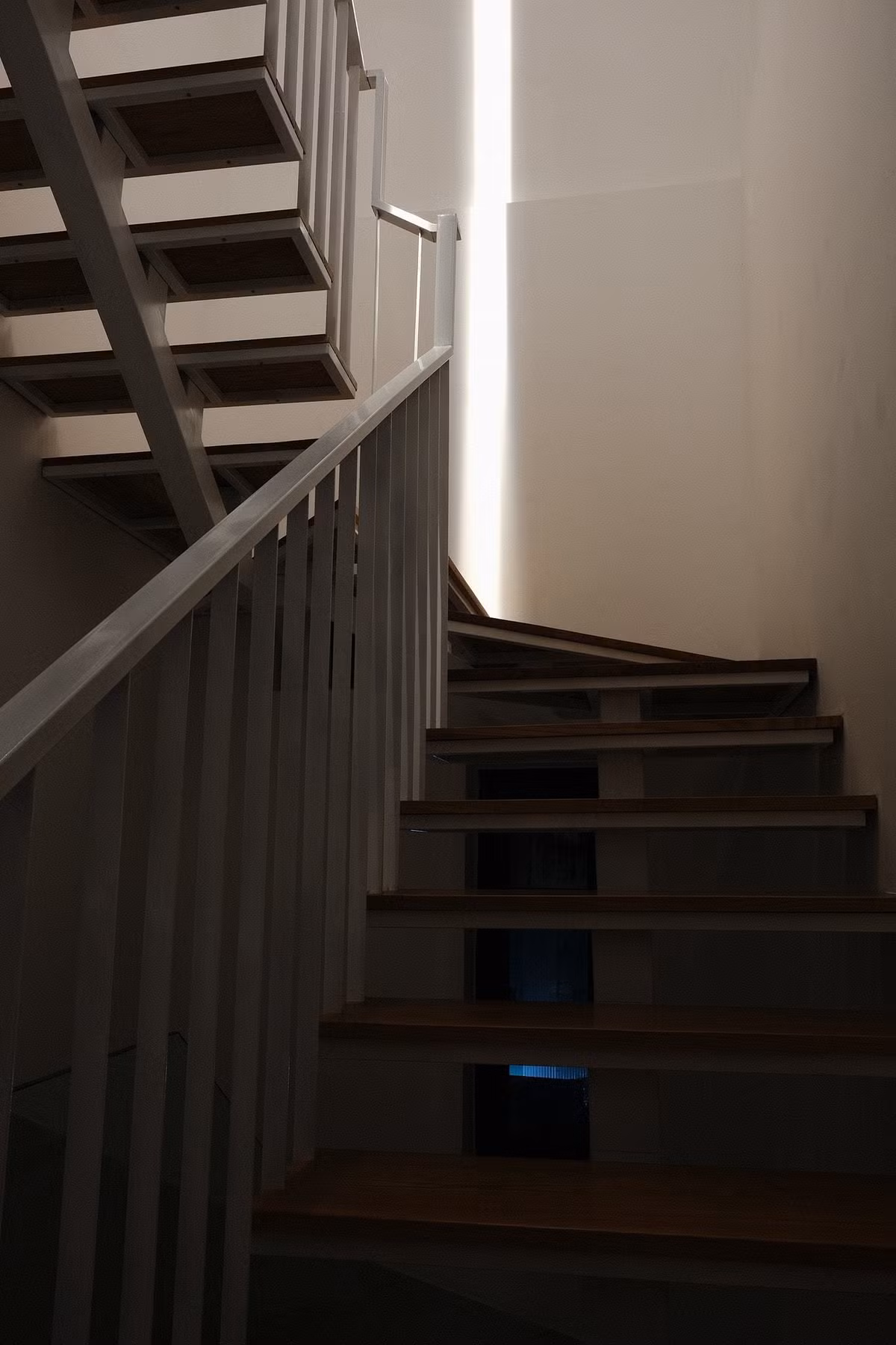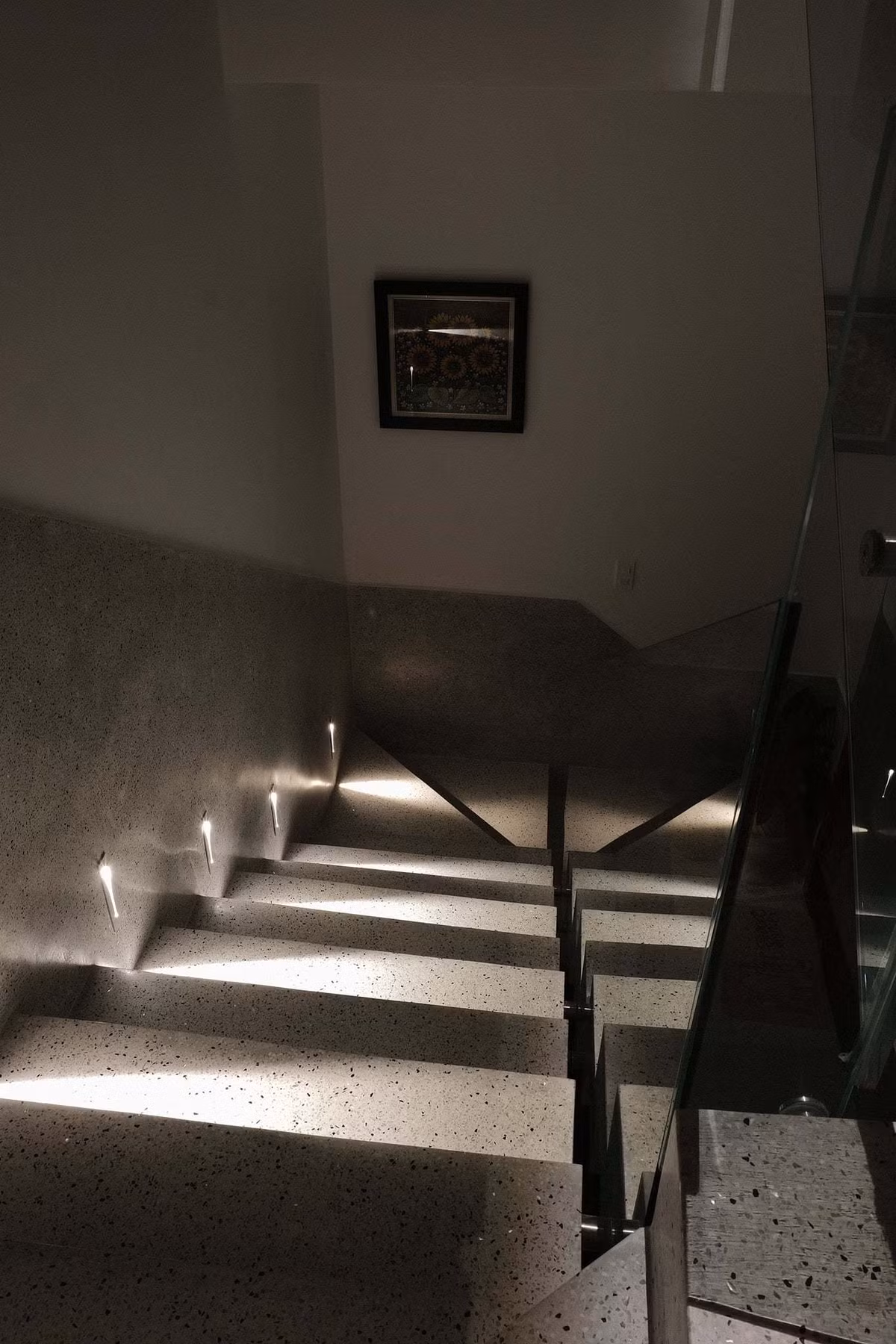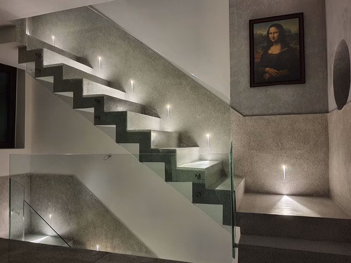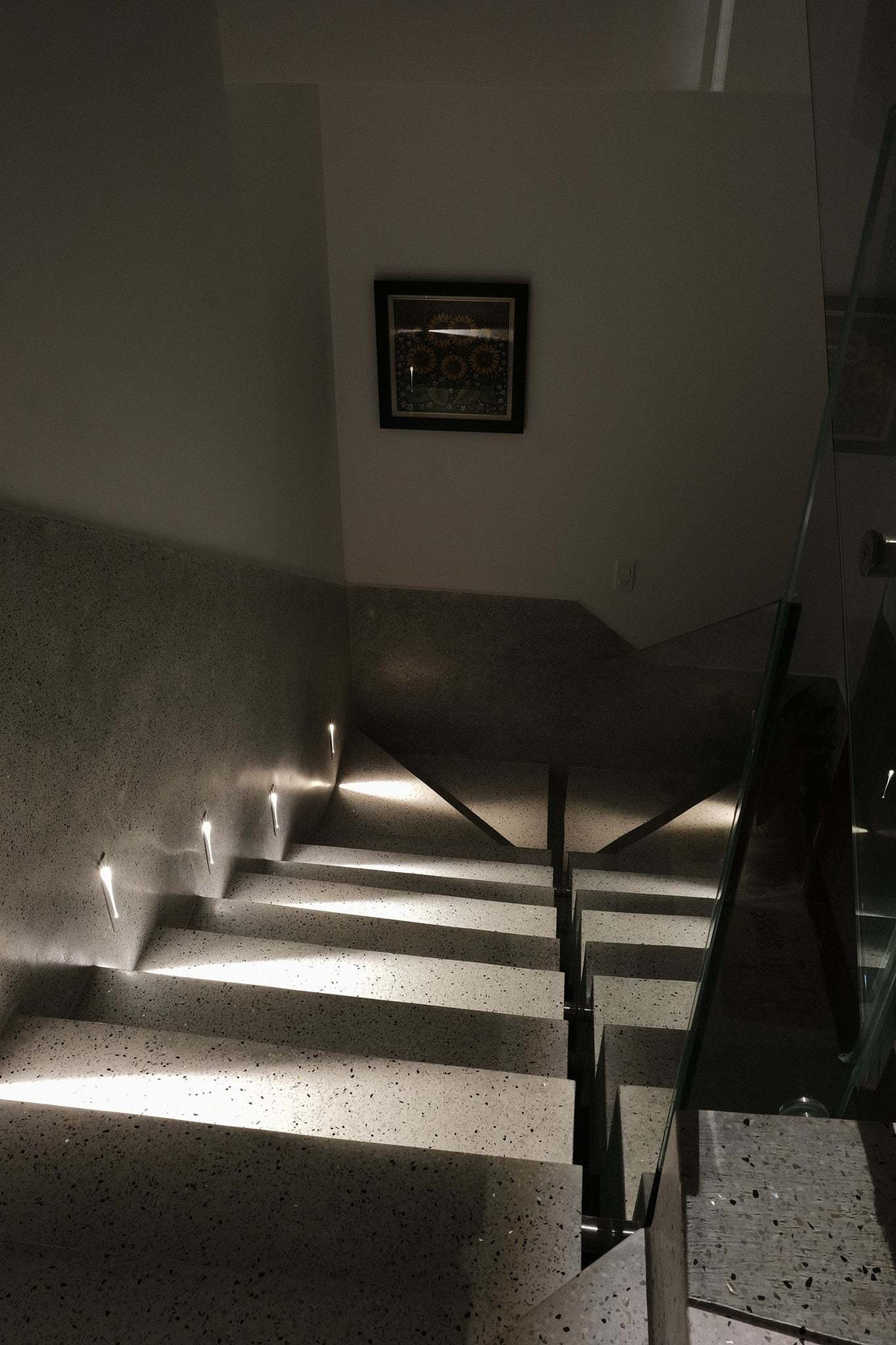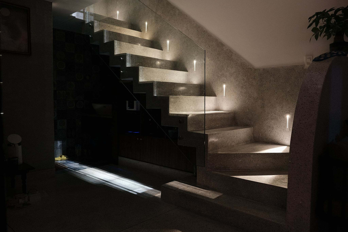 Cầu thang gắn đèn âm tường, lung linh vào buổi tối.