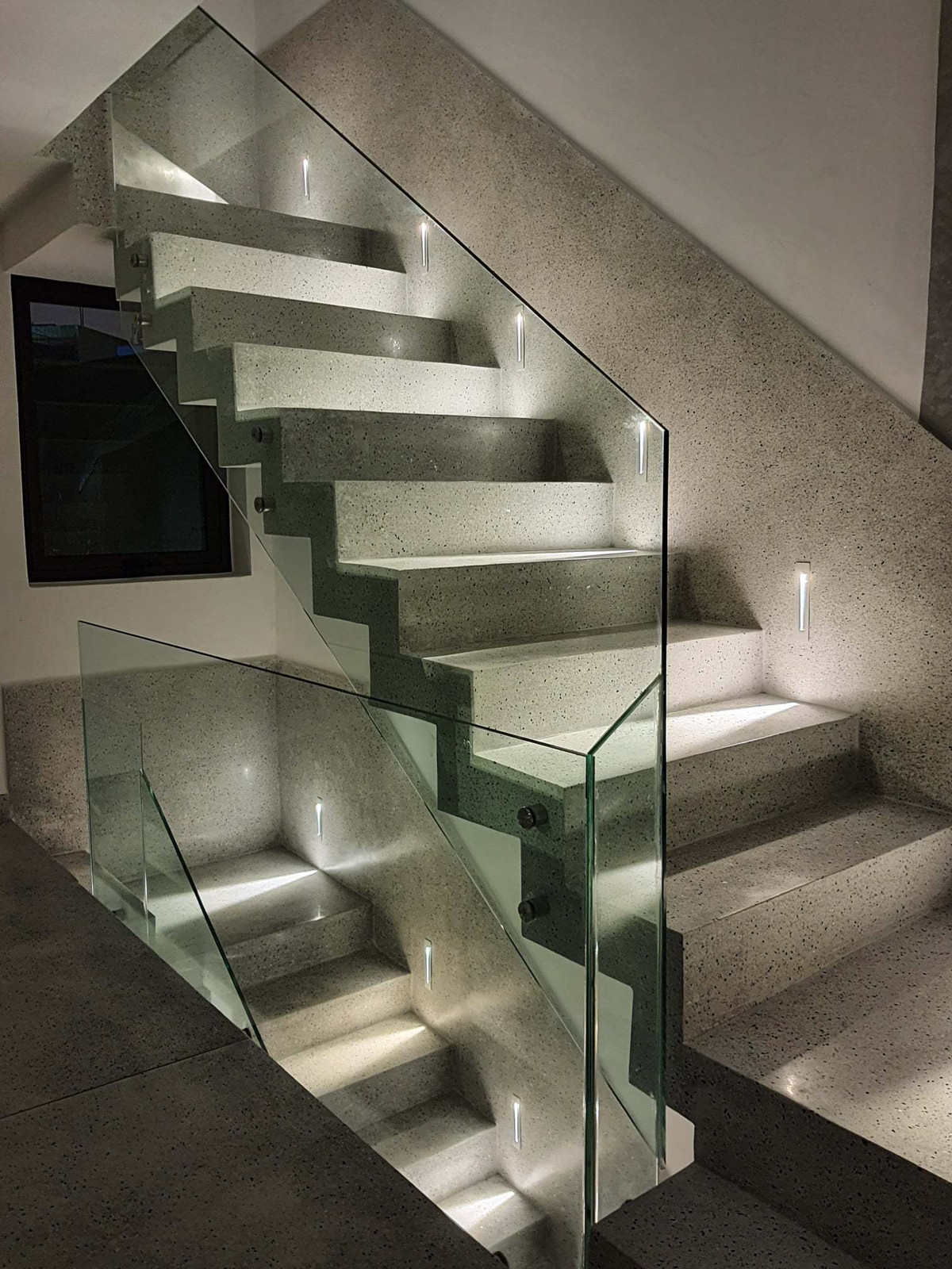 Cầu thang bê-tông mài, vách kính trong kết hợp đèn led tăng độ sang cho nhà.