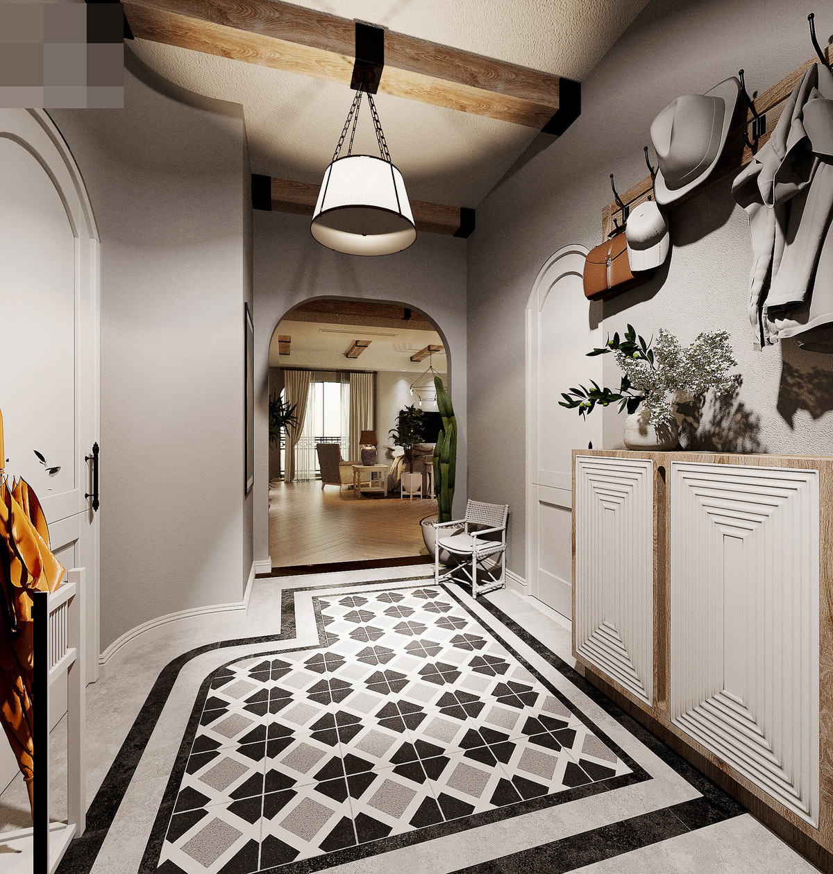 Chất liệu sàn và vách giống cầu thang tạo sự đồng điệu. Tấm vách này còn có ý nghĩa về mặt phong thủy là tránh được việc cửa nhìn thẳng vào cầu thang.