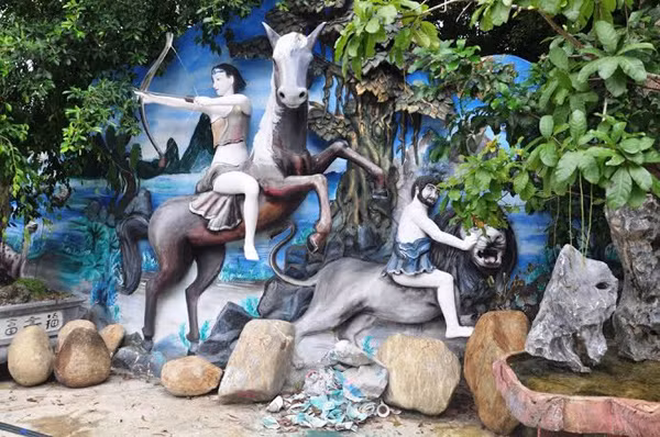 Trên những bức tường trong khu biệt phủ là tượng hổ oai phong, ao cá cùng những tảng đá quý. Chúng có xuất xứ tận miền núi Phước Sơn.