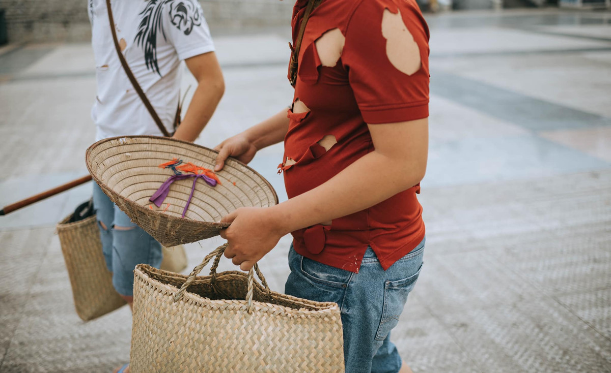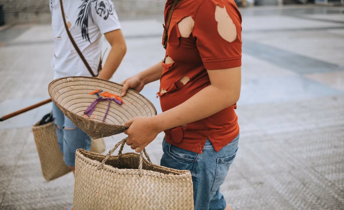 Bằng chứng là các anh đã chuẩn bị đầy đủ các dụng cụ như nón lá, gậy gộc,... Ngay cả bộ quần áo đang mặc cũng được “thiết kế” rách rưới cho hợp với hoàn cảnh.