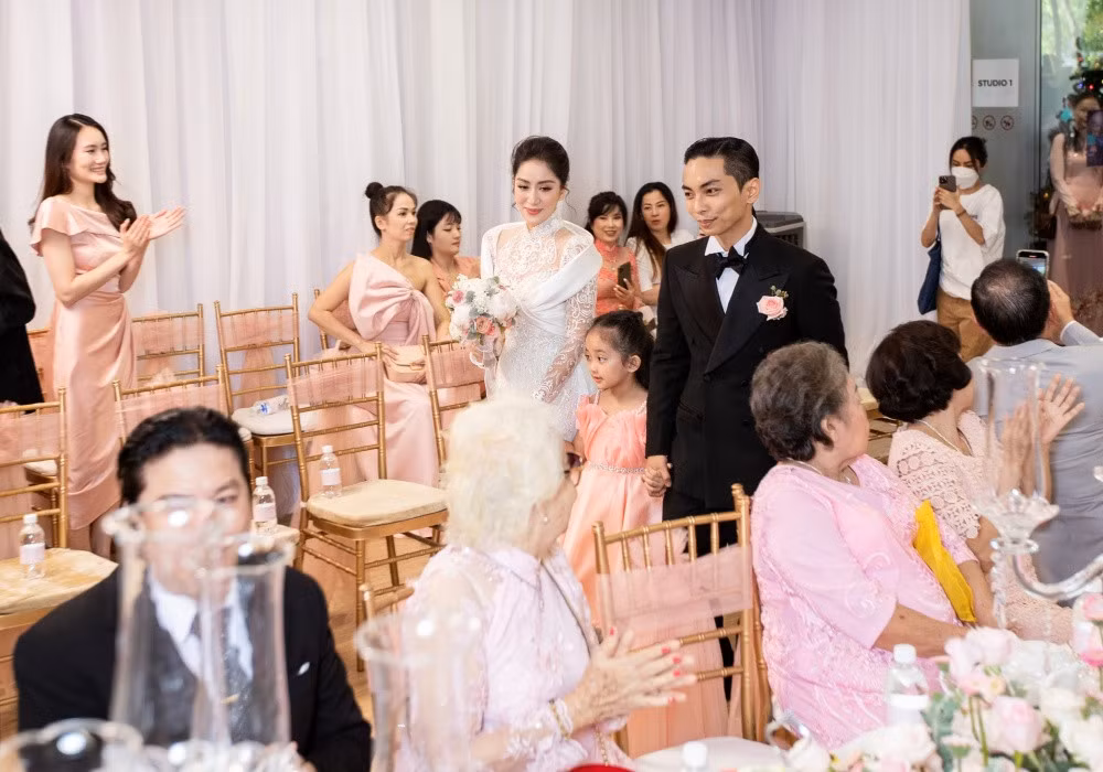 Đáng chú ý, buổi lễ còn có sự góp mặt của 2 người con của cô dâu - chú rể là Kubi và Anna. Cả hai thức dậy từ sớm, chuẩn bị trang phục và cùng xuất hiện bên bố mẹ bên dàn phù dâu, phù rể. Hình ảnh 2 con vui mừng chứng kiến hôn lễ của Khánh Thi - Phan Hiển khiến nhiều người chúc phúc.