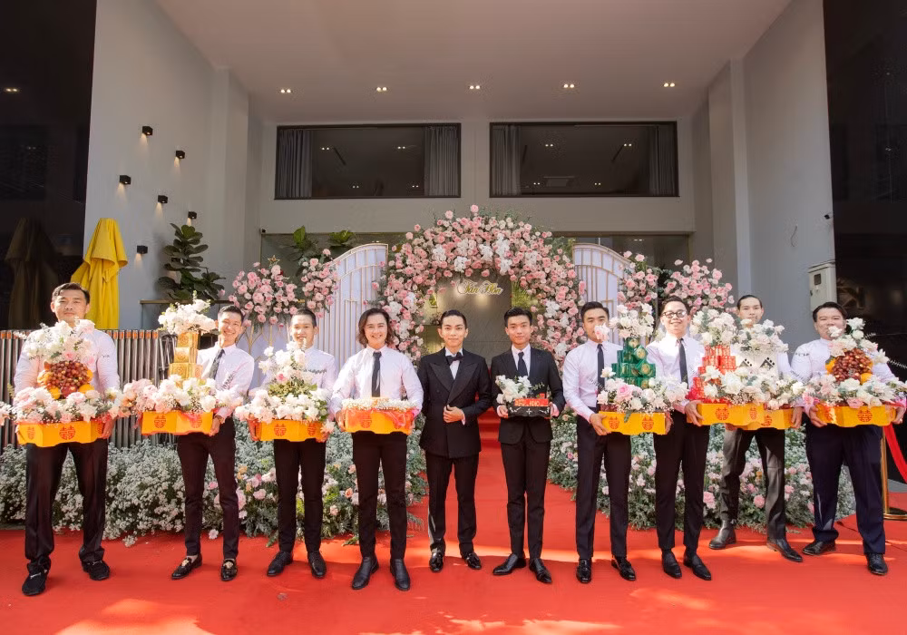 Trong phần lễ gia tiên, phần trao quà cưới được đại diện gia đình chú rể là bố mẹ Phan Hiển thực hiện. Sính lễ gồm tiền, vàng, các mâm cỗ gồm bánh, trà, rượu,… theo đúng nghi thức truyền thống.