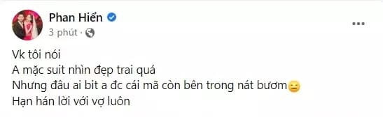 Ít phút trước, trên trang cá nhân của mình, Phan Hiển đã phải lên tiếng bày tỏ suy nghĩ của bản thân khi nghe lời nhận xét từ bà xã Khánh Thi. Cụ thể, nhìn thấy chồng diện cả bộ suit bảnh bao dự sự kiện, Khánh Thi nhanh chóng dành lời khen cho vẻ ngoài của chồng nhưng kèm thêm câu "nát lòng" ngay và luôn.
