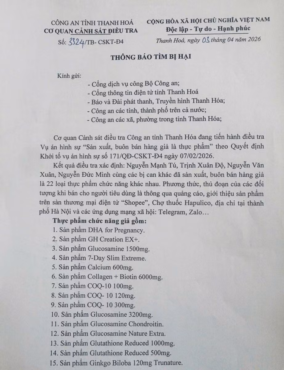 Công an tỉnh Thanh Hóa cũng khuyến cáo, những cá nhân có liên quan hoặc có thông tin về các sản phẩm này cần chủ động liên hệ, cung cấp thông tin trước ngày 30/4. Việc này không chỉ giúp bảo vệ quyền lợi của chính mình mà còn góp phần ngăn chặn hàng giả tiếp tục lưu hành trên thị trường.