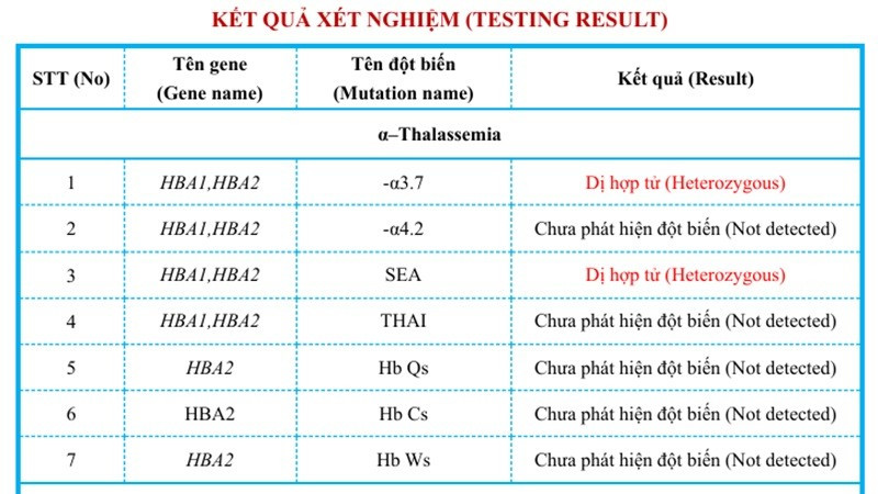 Kết quả xét nghiệm, sắt huyết thanh nằm trong giới hạn bình thường. Điện di huyết sắc tố phát hiện HbH và Hb Bart’s, đồng thời HbA2 giảm, gợi ý đến bệnh Thalassemia thể α (Alpha). Xét nghiệm gen phát hiện đột biến gen dị hợp tử kép --SEA/-α3.7 trong bệnh α-Thalassemia.