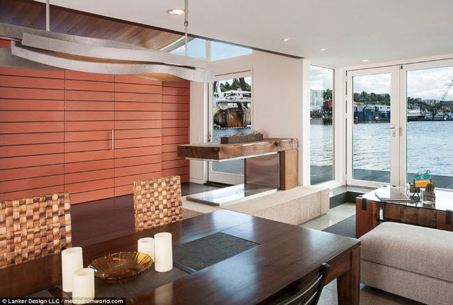Nhà thuyền được thiết kế bởi kiến trúc sư Michelle Lanker và chồng của cô, Bill Bloxom. Đây là không gian phòng khách của ngôi nhà độc lạ.