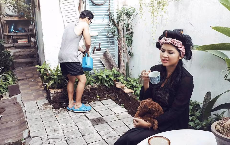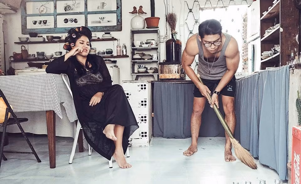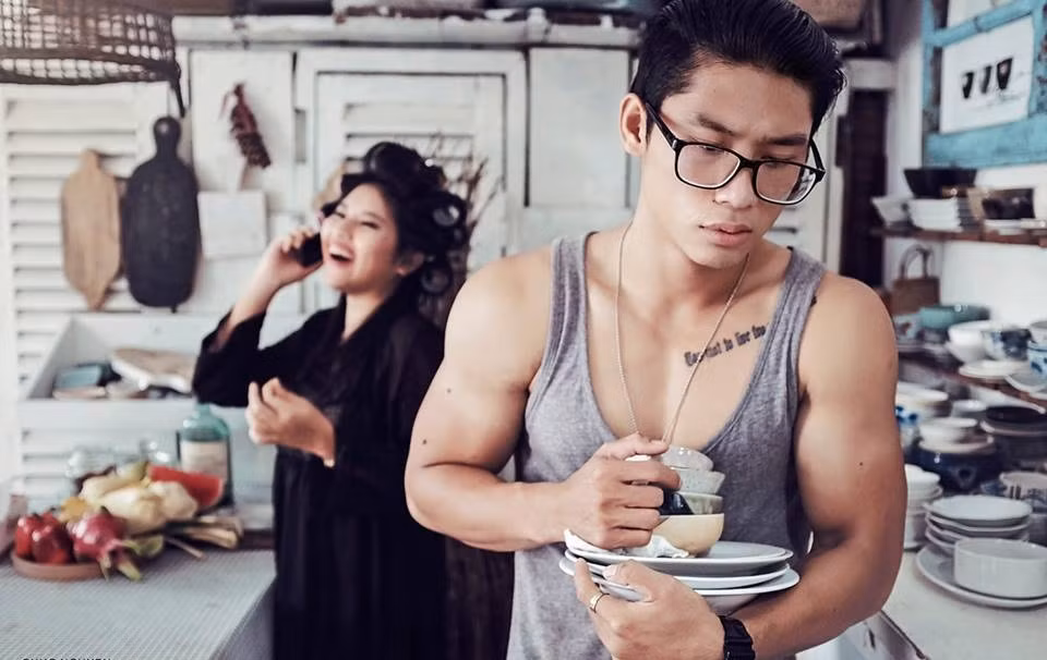 Trong bộ ảnh cưới, cô gái vào vai một cô vợ hung dữ và đóng vai trò như bà chủ của ngôi nhà, chuyên sai bảo, bắt nạt anh chồng hiền lành.