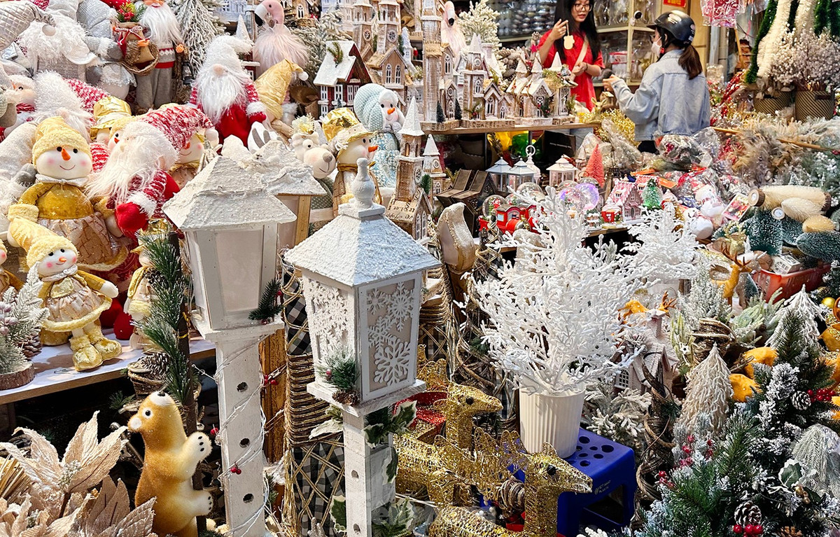 Chỉ còn hơn 1 tuần nữa là đến lễ Giáng sinh 2023, trên con phố Hàng Mã đã tràn ngập những món đồ trang trí như: Cây thông Noel, chuông Giáng sinh, bờm tuần lộc, ông già tuyết... tạo nên không gian lung linh, huyền ảo.