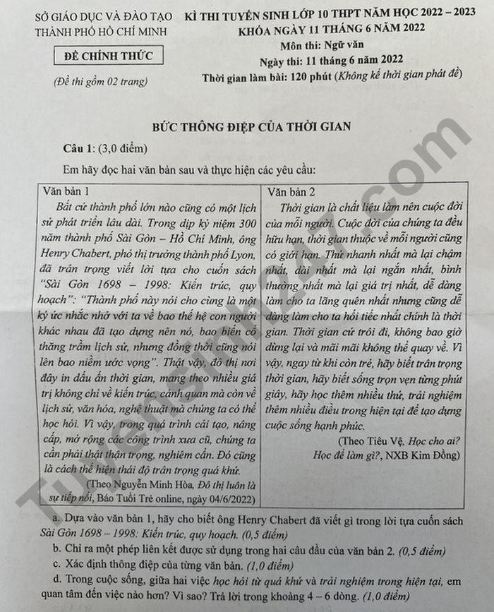 Đề thi Ngữ văn lớp 10 tại TPHCM năm 2022. Chiều nay, thí sinh sẽ bước vào môn thi ngoại ngữ với thời gian làm bài 90 phút. Việc chấm thi bắt đầu từ ngày 13/6 đến 23/6. Dự kiến ngày 24/6, Sở GD-ĐT TPHCM sẽ công bố kết quả kỳ thi tuyển sinh vào lớp 10.